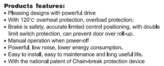 Description: Pleasing designs with powerful drive. With 120'c overheat protection, overload protection;Brake is safety, accurate limited control positioning, with doublelimit switch protection, can prevent door over roll-up. Manual operation when power-off. Powerful, low noise, lower energy consumption. Easy to install, easy to maintenance and long useful life. With the national patent of Chain-break protection device.